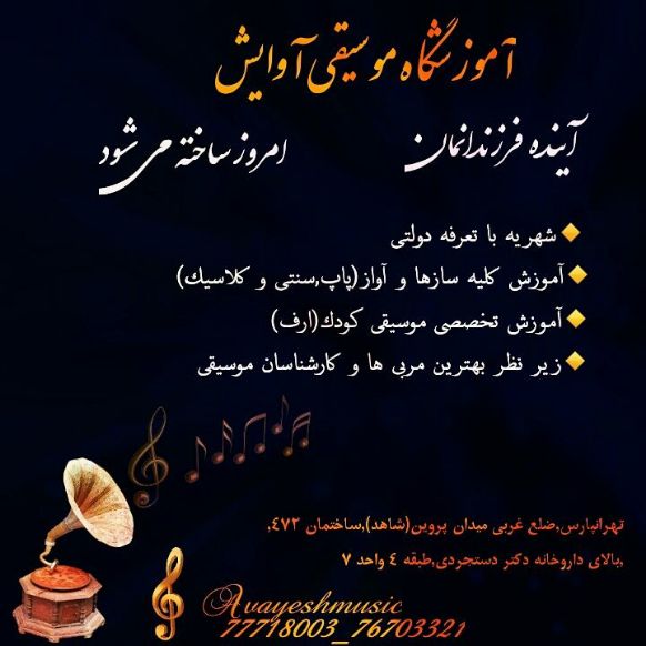 بهترین آموزشگاه موسیقی محدوده شرق تهرانپارس آموزشگاه موسیقی آوایش آموزشگاه موسیقی میدان پروین(شاهد) ◀️ با مجوز رسمی از وزارت فرهنگ و ارشاد اسلامی ◀️شهریه با تعرفه دولتی ◀️زیر نظر برجسته ترین اساتید دانشگاهی و فارغ التحصیلان موسیقی ◀️مشاوره رایگان با تعین وقت قبلی ◀️آموزش سازهای ایرانی, سنتی, پاپ, کلاسیک و آواز آموزش موسیقی کودک(ارف) ◀️آموزش سازهای گیتار, دف, تنبک, ویولن, کمانچه, سنتور, کیبورد, پیانو, ساز دهنی, فلوت, کلارینت, ساکسیفون, ترومپت, ترمبون, تار, سه تار, نی , تنبور و سایدرام(طبل ریز) ◀️آموزش تخصصی ترومپت و سایدرام زیر نظر استاد عباس دلیری آدرس : تهرانپارس, ضلع غربی میدان پروین(شاهد),ساختمان 472, بالای داروخانه دکتر دستجردی, طبقه 4 واحد 7 ☎️ 77718003- 76703321 📱09196414682- 09125705563 👉 🆔 @avayeshmusic اینستاگرام 👇👇👇 http://instagram.com/avayeshmusic